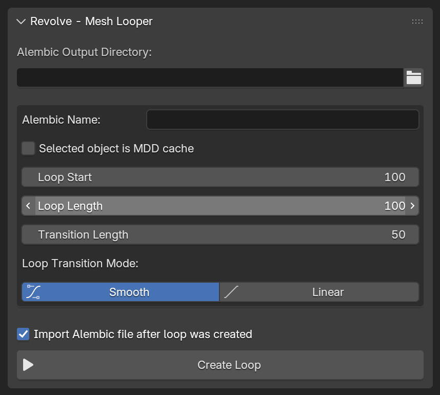 The addon automatically saves your loops as Alembic files for maximum compatibility. Optionally, to quickly check the export, this add-on loads the alembic file directly into the scene once it has finished creating the loop.